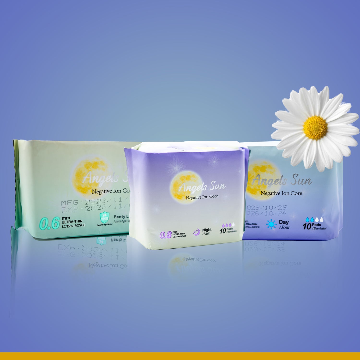 Nos serviettes intègrent une bande d’ions négatifs, une technologie avancée qui aide à soulager les douleurs menstruelles, à traiter les infections mineures et à maintenir l’équilibre de la flore vaginale.
